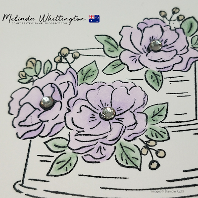 - I highlighted the image in selected areas with the following Stampin' Blends. Mint Macaron, Purple Posy and Crumb Cake.